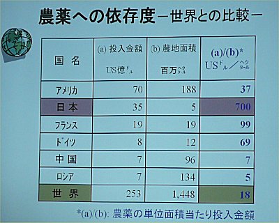 | 農薬の使用量(金額)では世界第二位だが、単位面積当たりの使用量(金額)はダントツの一位である。(1ヘクタール8万円以上) |