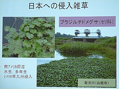 | 山口教授が九州各地を調査し特定外来生物に指定された植物を多数確認。最近まで園芸店で良く売られていたボタンウキクサ(ウォーターレタス)も指定されていてびっくりしました。 |