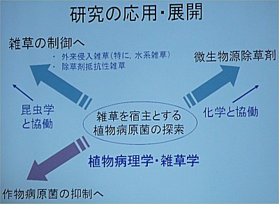 | 植物病理学・雑草学により作物病原菌の抑制や雑草の制御、除草などに展開ができる |