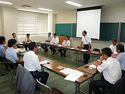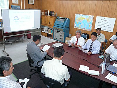 | 延岡市中小企業振興センターにおいて、「延岡市工業振興ビジョン」の説明を受ける。たっておられる方が飯干商工部長。 |