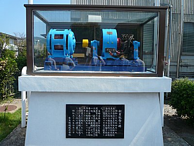 | 入り口には開業記念の碑がある。昭和29年開業当時の直流発電機が飾られている |