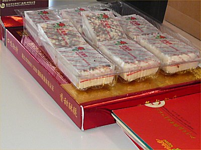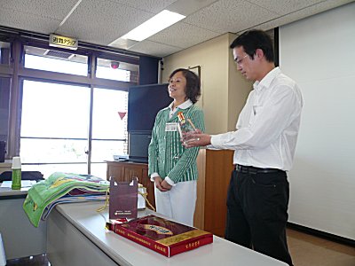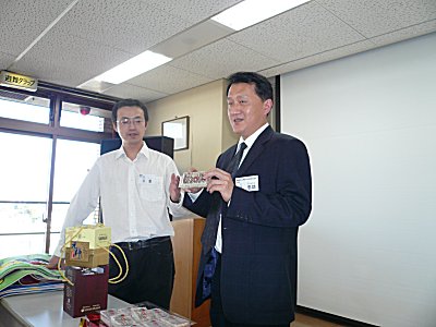 | 自社製品のお菓子の紹介をする王忠効氏 |