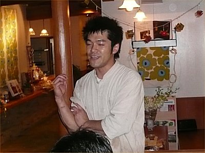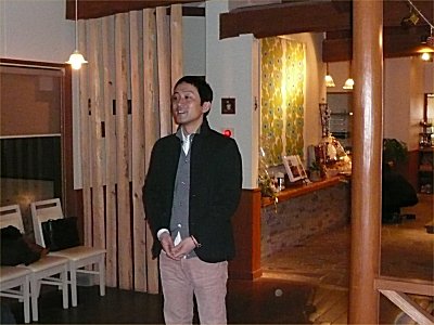 | 本日のワインを選んでくれたクラレットの松宮州平さん。つい最近ソムリエの資格を取ったばかり。ソムリエ試験の様子など興味深い話が聞けました。 |