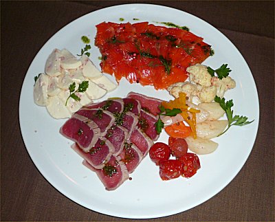 | 魚の前菜。サーモンのマリネ、日南のマグロを岩塩とハーブで、チーズ、地元の野菜 |