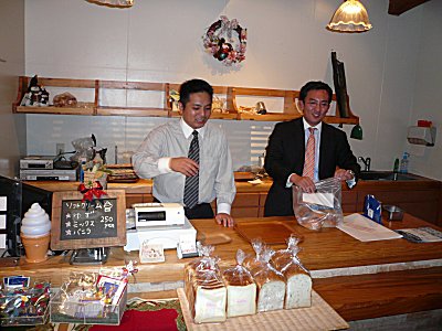 | 松原さんが笑顔でパンのサービス。パンはいろいろな種類をたくさん頂きました。 |