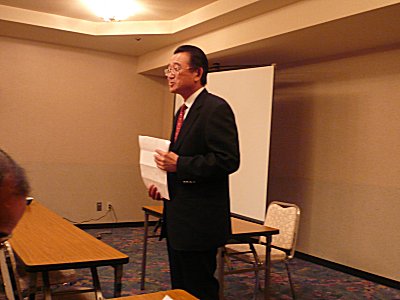 | 本日の例会担当寺薗さんのあいさつ。担当は他に谷口さん、吉原さん。 |