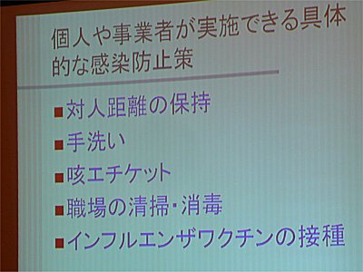 | 1月例会はツカサ電工(株)の鮫島さんに「新型インフルエンザ危機管理について」と題して講演をして頂きました。新型インフルエンザの流行が懸念され、企業としても危機管理を考えておかなければなりません。大企業においては防護服や食糧まで備蓄する動きも出始めています。新型インフルエンザの知識と、今できる対策について学びました。 新年会には足立先生が中国から連れて来られた中国湖北解放實業有限公司副総経理の王建榮さんや綾町などで有機完全無農薬栽培に取り組んでおられる華ぜんの黒木社長も参加、多彩な顔ぶれで貴重な情報交換ができました。 |