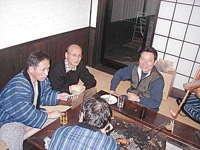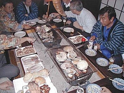 焼奉行:東郷さんがホタテ、イカ、サンマ、地鶏などを用意、鍋奉行:朝倉の用意した味噌鍋も別室でぐつぐつ。