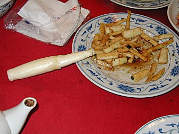 「マコモ」とか聞こえましたけど、ウドのような竹の子のような。歯ざわりがシャキシャキしておいしい。しつこく聞いたら調理前のものを持ってきてくれました。(写真左) |