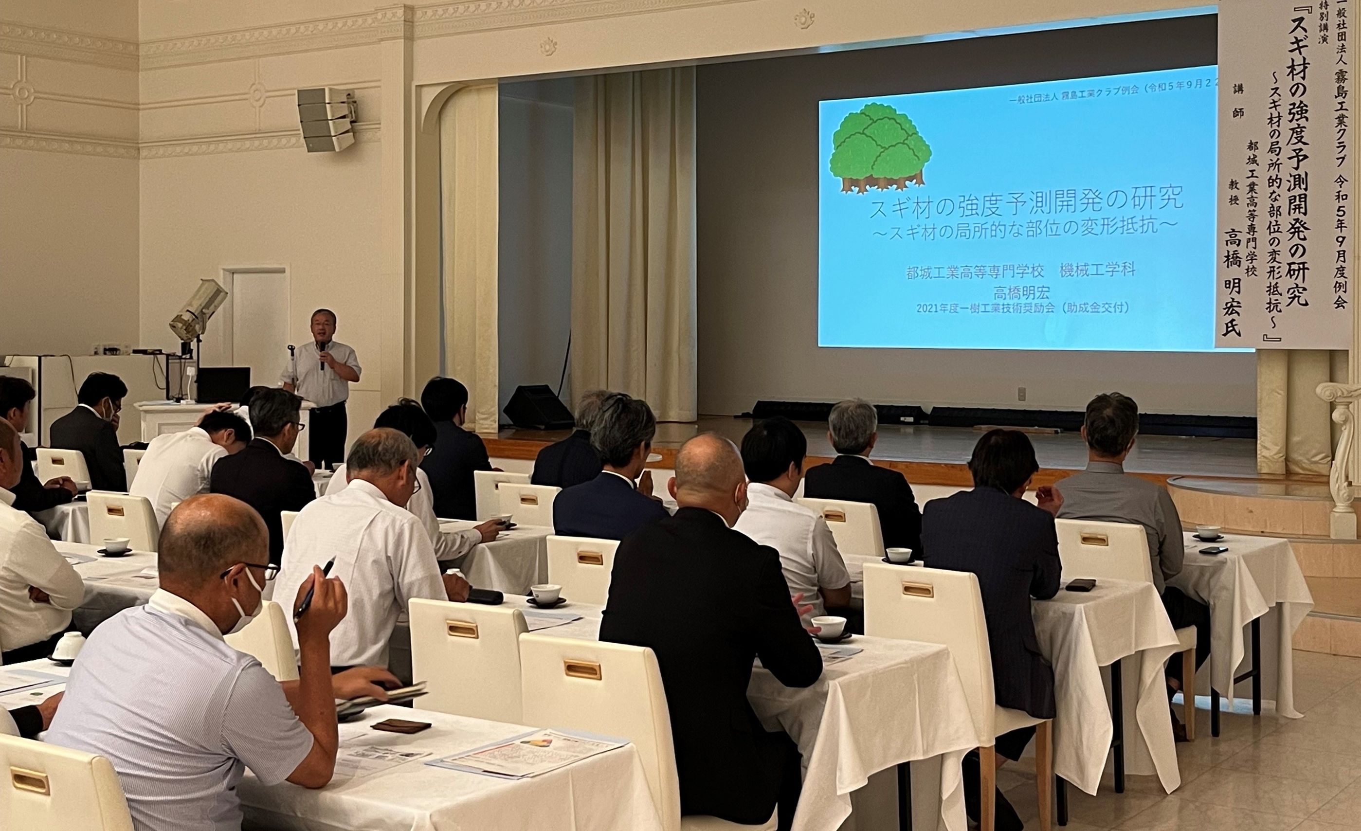 特別講演は、都城高専機械工学科教授の高橋明宏先生に「スギ材の強度予測開発の研究 (副題)〜スギ材の局所的な部位の変形抵抗〜」という演題にて、ご講演いただきました。
