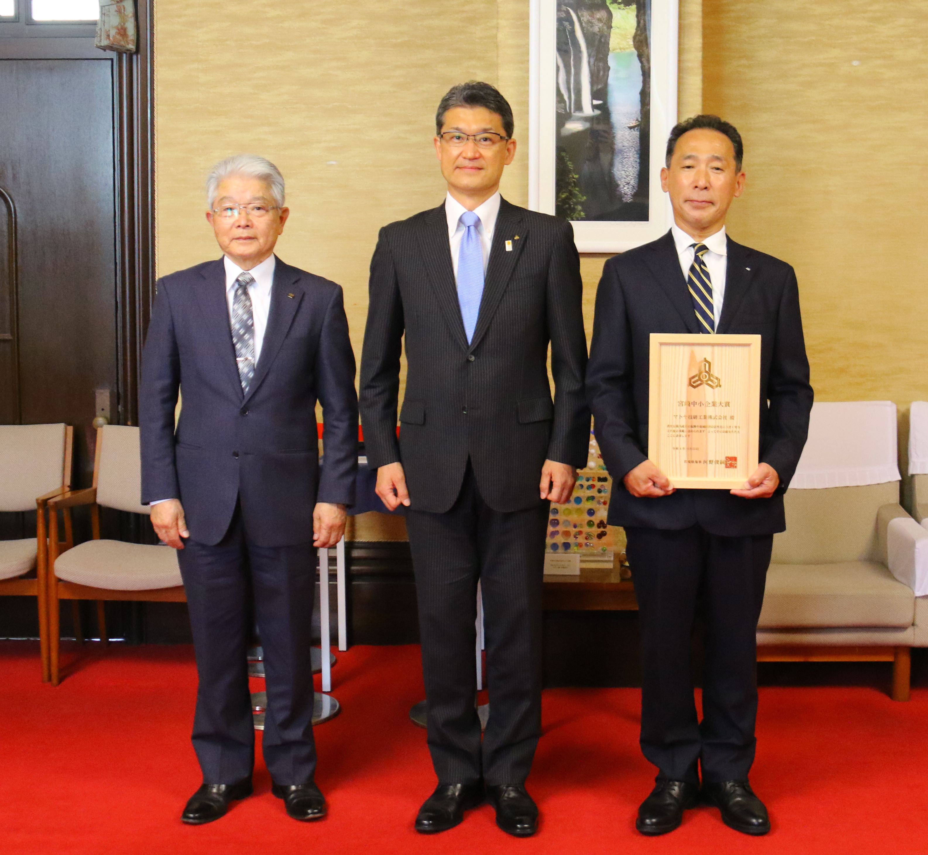 河野知事は、「受賞おめでとうございます。日頃の工夫と努力に敬意を表します。宮崎の中小企業の素晴らしいモデルとなって、これからもそれぞれの立場で頑張ってください。」と述べました。