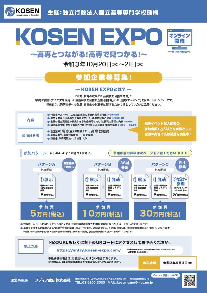 【お知らせ】 KOSEN EXPO の申込期限が9/17迄となりました 2021.9.07