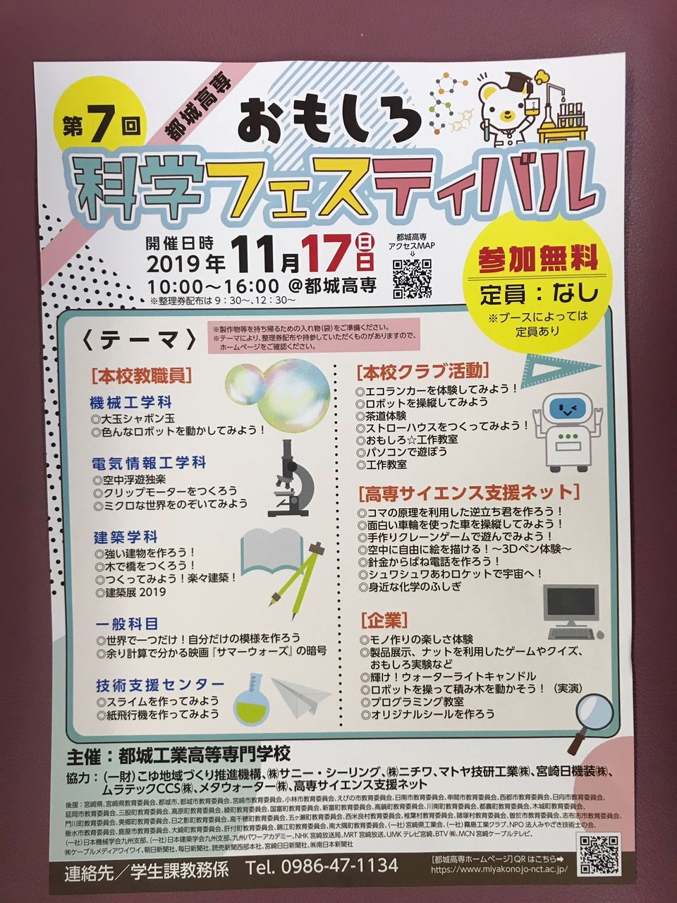 11月17日(日)都城高専において、第7回都城高専おもしろ科学フェスティバルが開催されました。このフェスティバルは、小中学生を中心とした未来ある子どもたちに、科学のおもしろさを伝え、将来の日本の産業界を支えるための人材育成に寄与する目的で開催されたものですが、1,620名の多くの方々にご参加いただき、各ブースにおいて、さまざまな実験や工作に親しんでいただきました。
