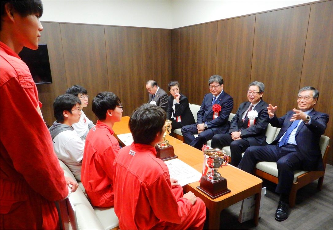 表彰式では、独創的なアイデアを満載し、それを実現させたとして審査員満場一致で都城高専が文部科学大臣賞(アイデア賞)に選ばれ来場されていた萩生田文部科学大臣より賞状とトロフィーが授与されました。