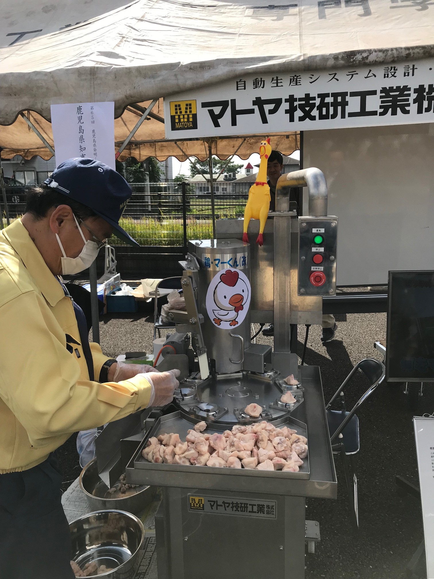 霧島工業クラブも後援しており、今年は、会員企業のマトヤ技研工業(株)のご協力を得て、「鶏・マー君」鶏ボンジリ自動脱骨機を出品して頂き、鶏のボンジリ( 鶏の尻尾に当る部分)焼きを、無料の「ふるまい」として提供して頂きましたが、待ち時間が出来るほどの盛況振りでした。(写真参照)