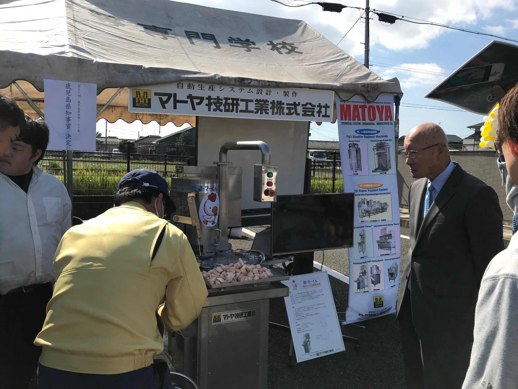 都城高専文化祭2017が11月4日(土)に開催されましたが、マトヤ技研工業(株)から「鶏・マー君」鶏ボンジリ自動脱骨機が出品され、ボンジリの骨をカットする実演と共に、骨抜きのボンジリを調理して、学生をはじめとする来場者へふるまわれました。